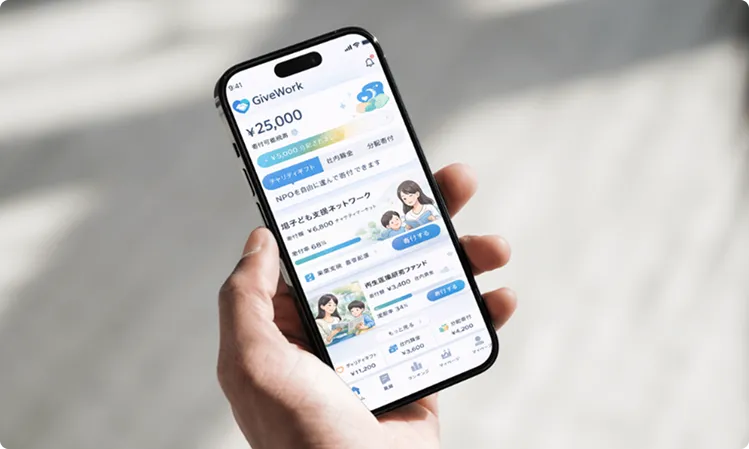 社会のために働く会社へ 社会課題解決のために動く会社を社員参加型寄付アプリとメディアで応援する 寄付を始める 会社と、そこで働く社員の皆さんは常にお客様のために奔走しています。そして、お客様を通して「社会」に役立っています。しかし、働いていると、「この仕事は社会の役に立っているのか」と疑問が湧くことがあります。社会の役に立っている仕事でも、忙しすぎて立ち止まって考える機会が無いことも。GiveWorkは会社と社員さんが働いて得たお金を「一緒に」寄付することで、社会貢献を直接的に実感できるツールです。寄付したお金は会社と、その社員の皆さんで頑張って得たお金。それを社会に還元することで社会貢献の実感を「自分ごと」として捉え、たとえそれが偽善であっても、「良いこと」だとわたし達は考えています。 従業員参加型の寄付で企業寄付のメリットを拡大 Giving Together Builds Engagement 社会貢献(CSR)の認識が高い会社はこんな傾向があります。 エンゲージメントが高くなる 会社へコミットメントしやすくなる 仕事満足度が高くなる 離職率が下がる 雇用主としての魅力が上がる SERVICE GiveWorkのサービス GiveWork APP チャリティギフト・社内募金・分配寄付といった従業員参加型の社会貢献DXツールです。NPOや研究機関を指定してチャリティギフトページを発行し、社員さんに寄付先を自由に選んでいただけます。企業寄付をただ行うだけでなく、社員さんを巻き込んで社会貢献活動を行うことにより、モチベーション維持や採用の際のアピールにも役立ちます。 詳しくみる ソーシャルエッグ チャリティギフト・社内募金・分配寄付といった従業員参加型の社会貢献DXツールです。NPOや研究機関を指定してチャリティギフトページを発行し、社員さんに寄付先を自由に選んでいただけます。企業寄付をただ行うだけでなく、社員さんを巻き込んで社会貢献活動を行うことにより、モチベーション維持や採用の際のアピールにも役立ちます。 詳しくみる 様々なご利用方法 Flexible Ways to Use GiveWork GiveWorkは、企業の想いや目的に合わせて柔軟に活用できる、社会貢献DXプラットフォームです。 寄付を「企業だけの取り組み」にせず、社員一人ひとりを巻き込むことで、社会貢献とエンゲージメント向上を同時に実現します。 従業員参加型寄付 Employee-Participatory Giving 企業が拠出した寄付金を、社員一人ひとりが想いを込めて分配。 NPOや研究機関を自由に選べる仕組みにより、 「自分も社会貢献に参加している」という実感を生み出します。エンゲージメント向上や離職防止にもつながる、新しい寄付のかたちです。 寄付専用サイトの立ち上げ Launch of dedicated site 地方自治体や多数のグループ企業を抱える会社様が、自社専用アプリを立ち上げするプランです。立ち上げをする母体が金額を負担することによって、その母体に関連する会社様が無料、または少額の費用でGiveWorkを利用することができます。 福利厚生サービスへの導入 Implementation of benefits services 福利厚生サービスを運営されている会社様向けのプランです、福利厚生サービスのパッケージにGiveWorkを導入いただくことで、独自性を向上させることができます。パッケージ内に企業寄付のサービスを追加することで、サービスのブランド強化にも寄与します。